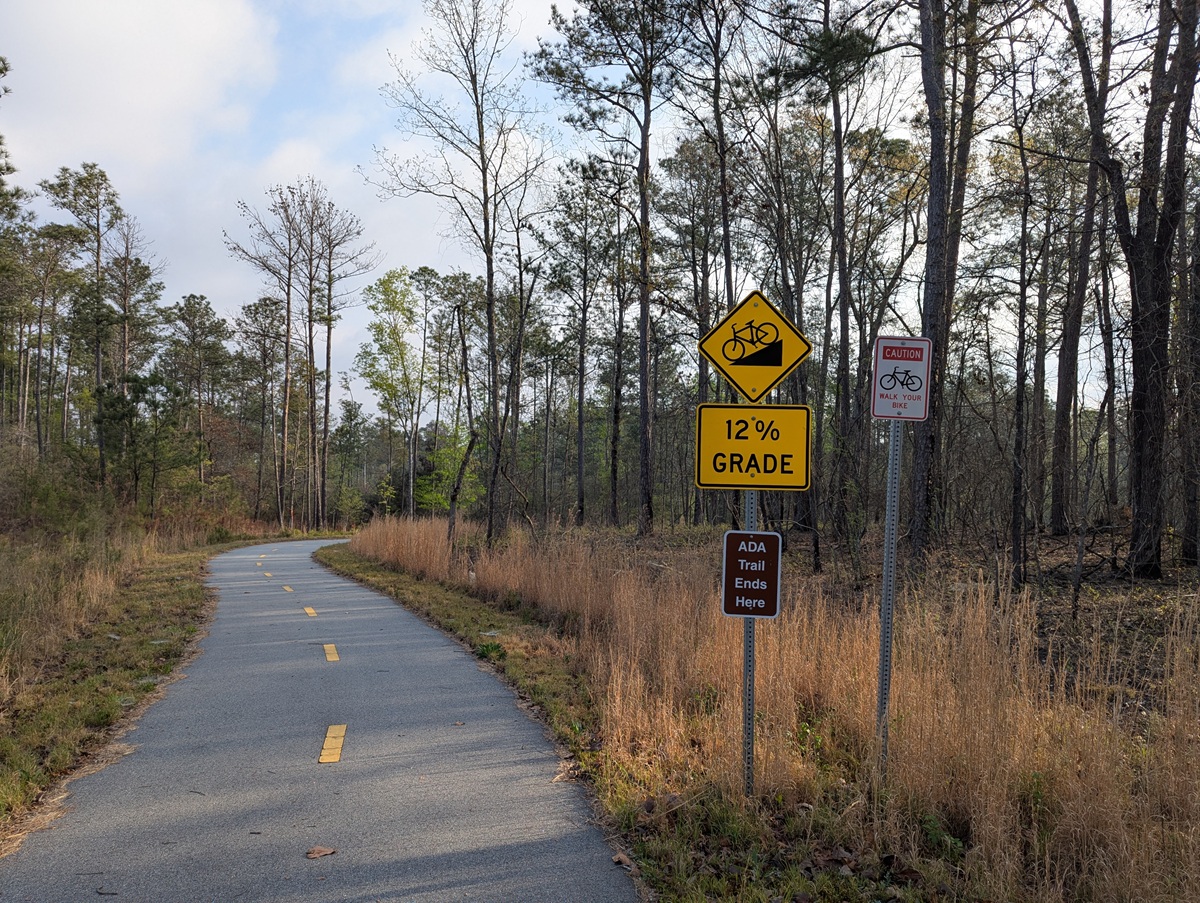 At about 1 mile in, posted signs warn of a 12% grade, noting that the ADA trail ends and recommending cyclists walk their bikes.