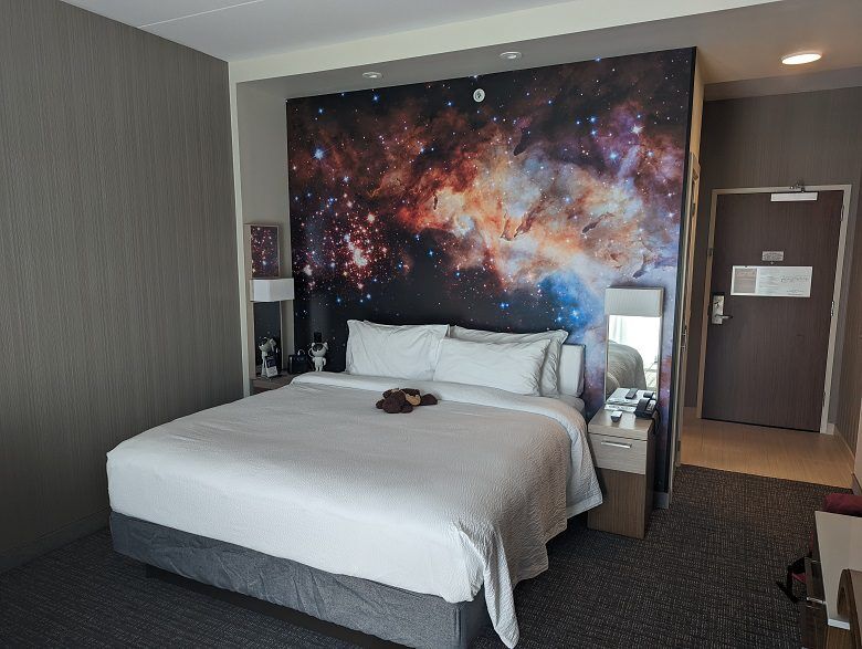 I loved the hotel’s commitment to the space theme, and we put the little astronaut projector on and relaxed with the nebulas playing across the ceiling as we watched a space-themed movie. I thought the room was very spacious, clean, and cozy.