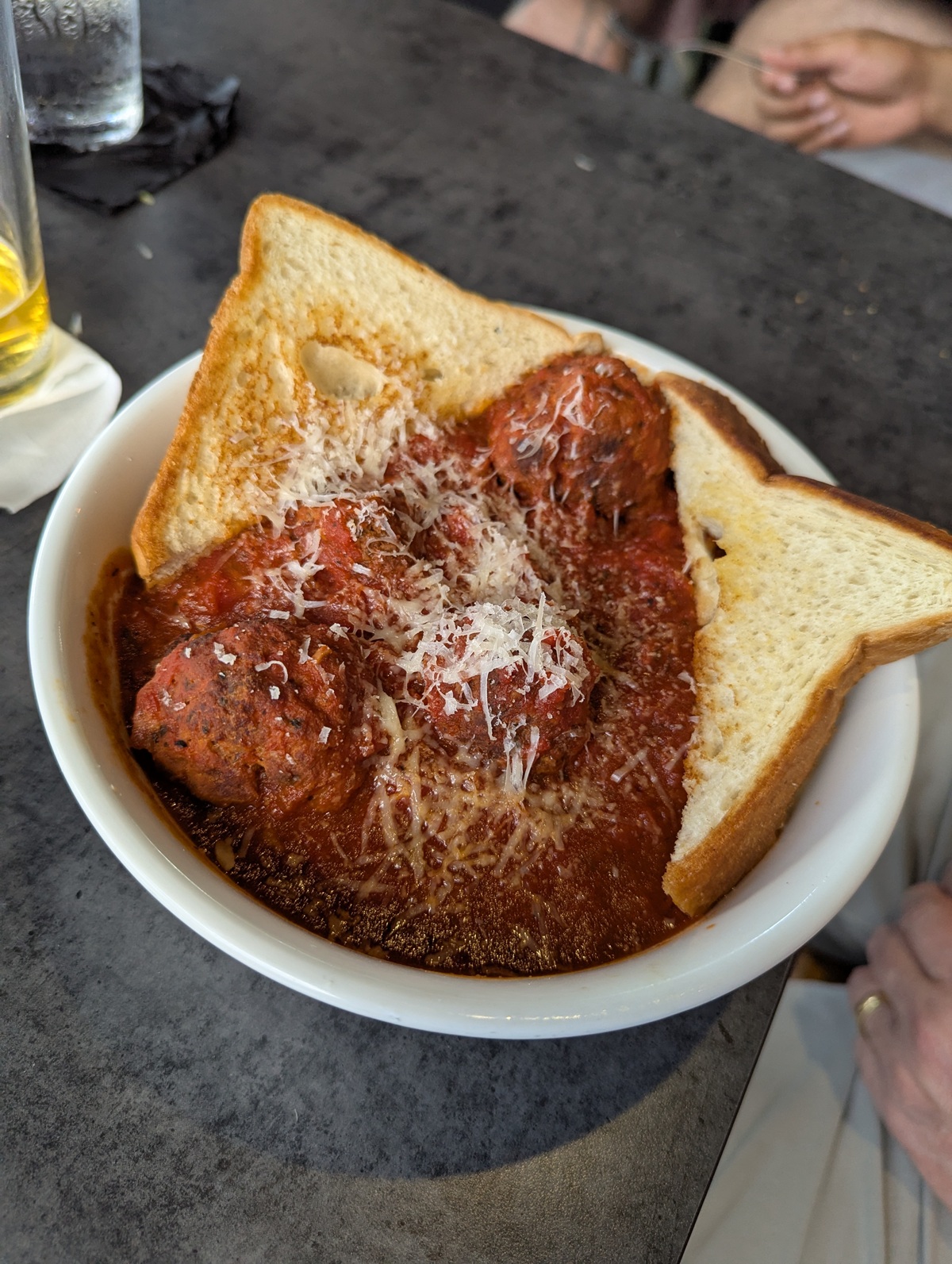 I recommend the Ginger Scallion Noodles, the Smoked Brisket Sandwich, and the Homemade Spaghetti and Meatballs. To drink, go for Karma.