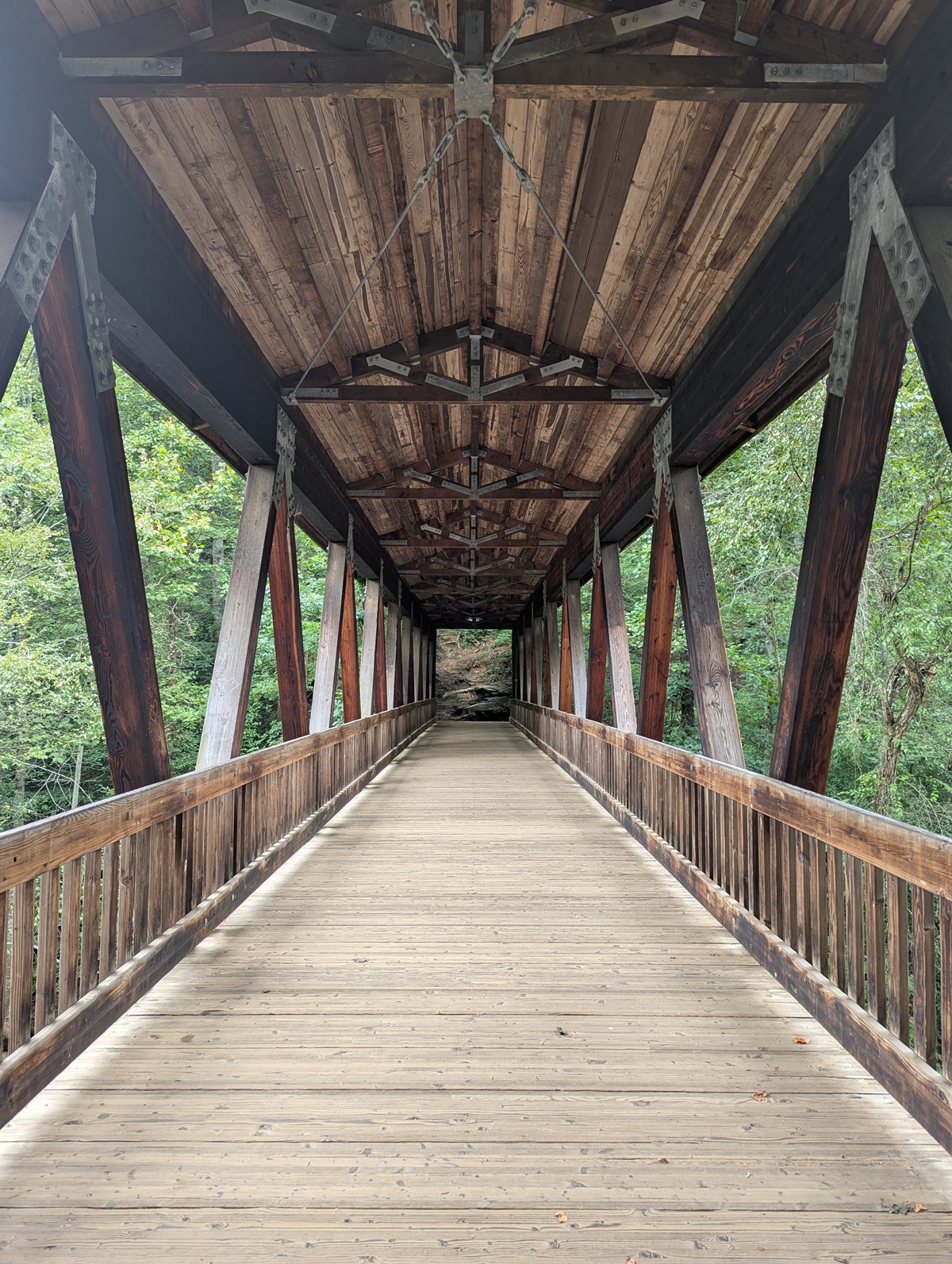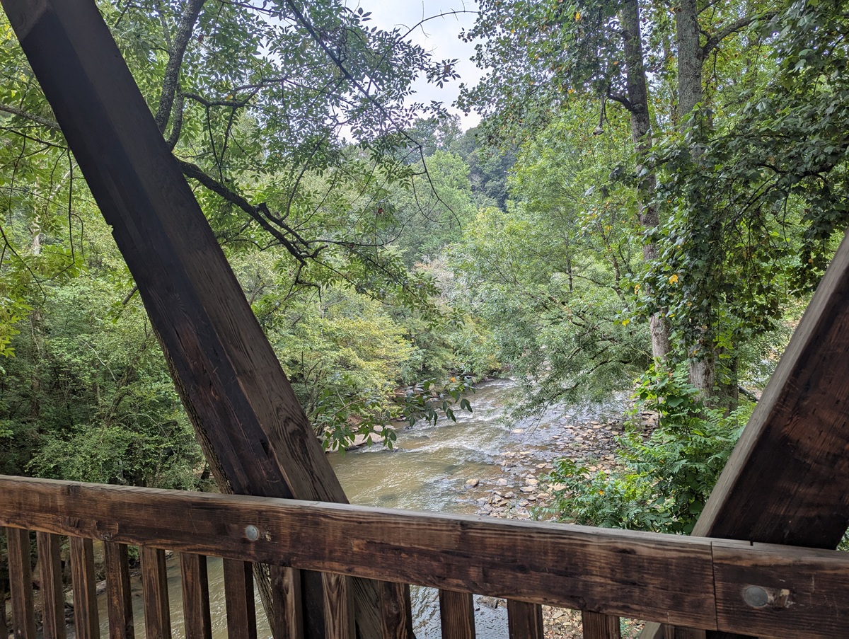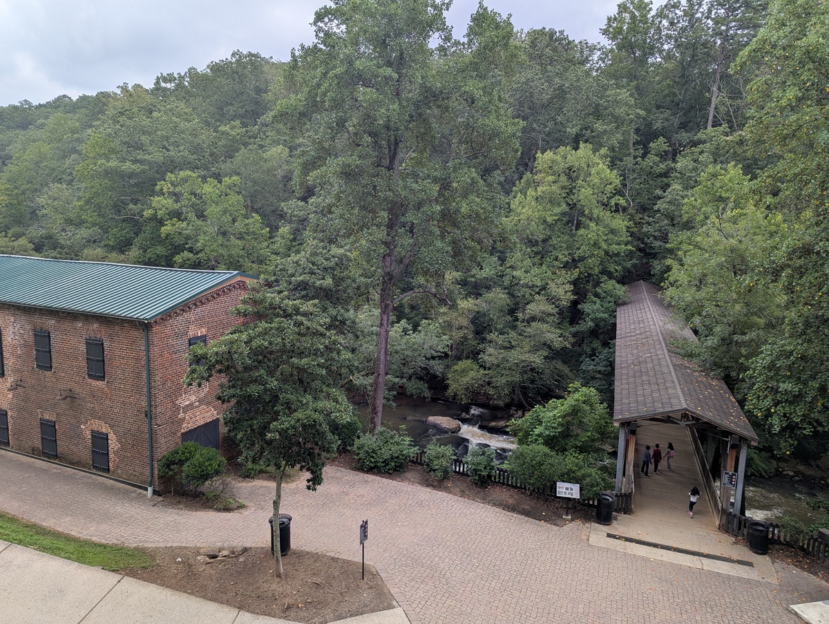 From there, retrace your steps back to the Machine Shop. The then trail crosses the Historic Roswell Mill Covered Bridge that spans Big Creek and connects Old Mill Park to the Chattahoochee River National Recreation Area. The covered bridge provides a great view of the mill ruins and the creek.