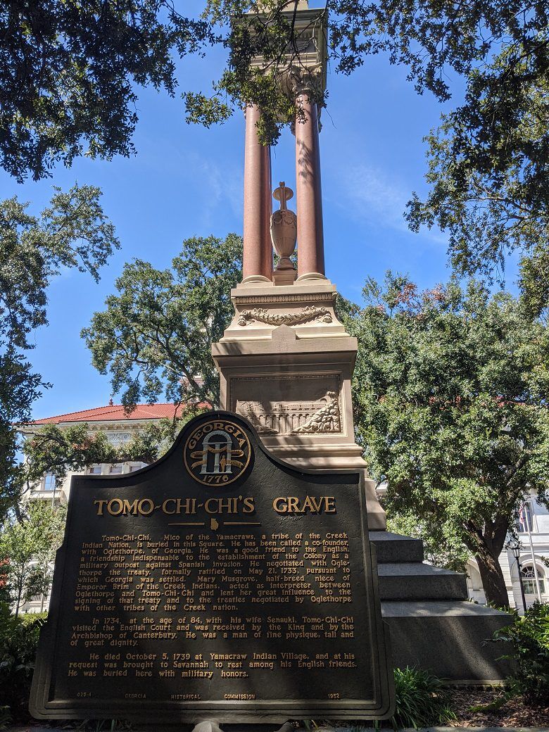 Later, a large granite boulder with a copper plate was erected at the southeast corner of the square as a monument to Tomochichi, along with a historical marker at the original gravesite.