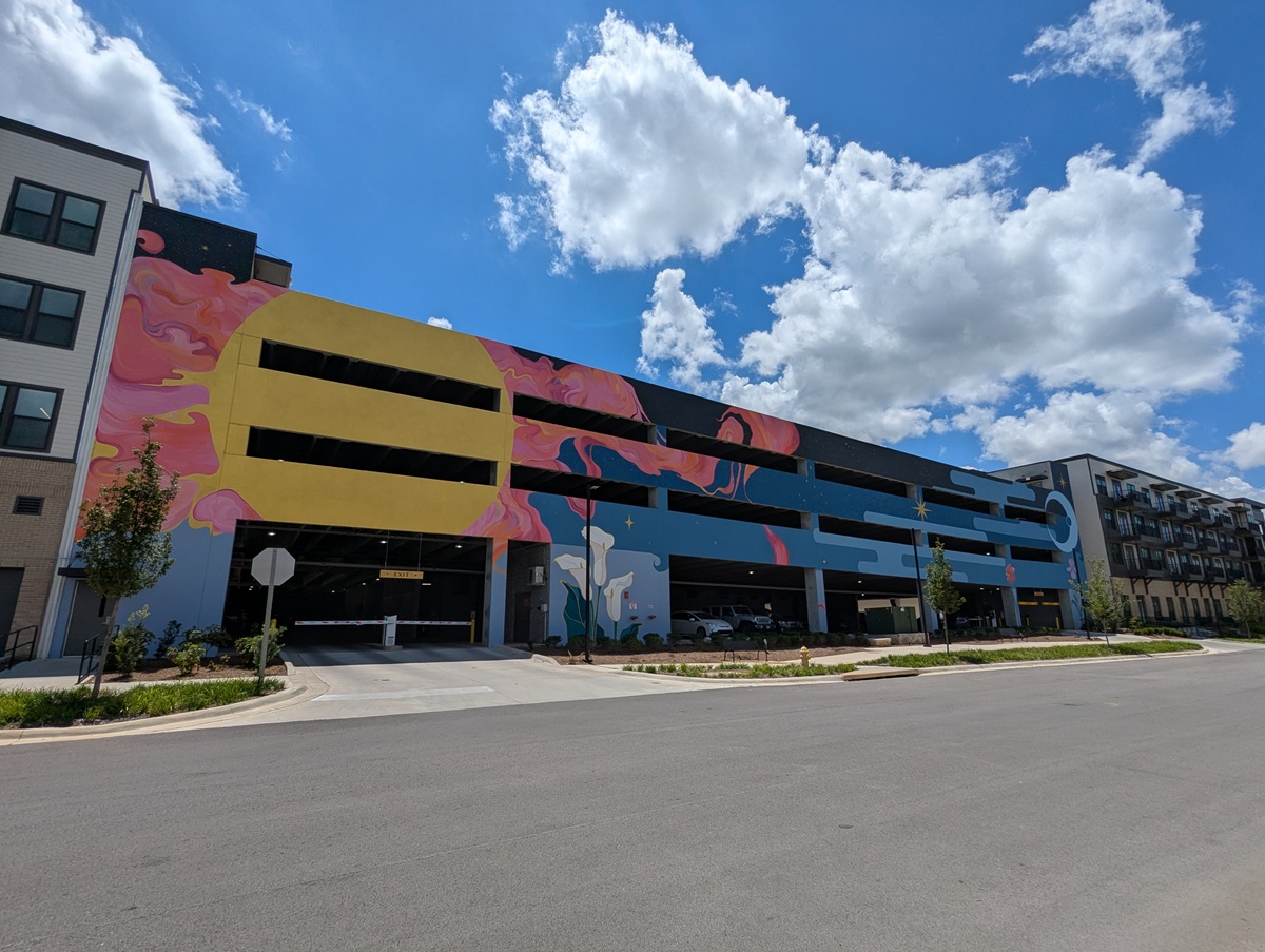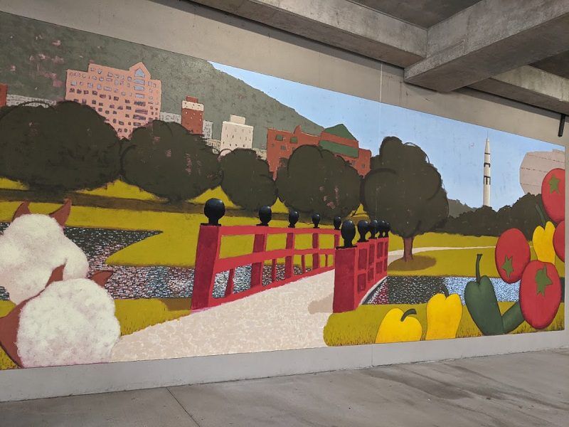 The parking deck at the Shops at Merchants Walk features unique Huntsville-centric murals by artists Robert Daniel and Andy Winn. The mural against the Whole Foods features Big Spring International Park, the skyline of Downtown Huntsville, and the U.S. Space & Rocket Center.
