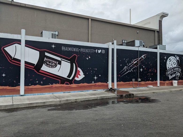 Along the backside of Baumhower’s Victory Grille on Memorial Parkway, you’ll find a set of four spaced-theme murals including an astronaut, a couple rockets, and the moon.