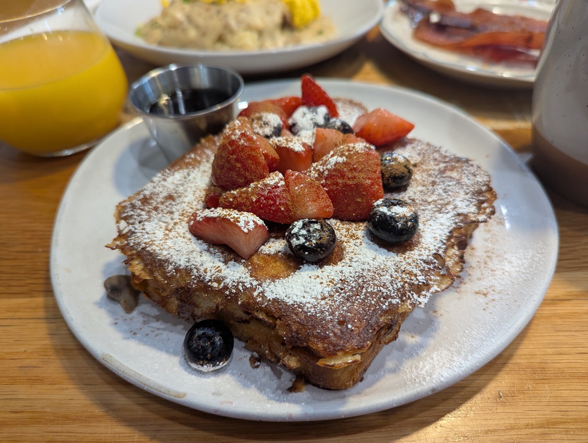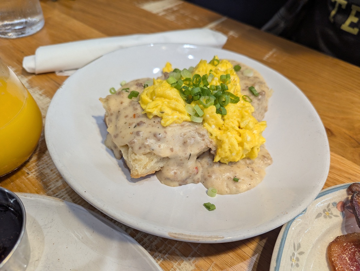I recommend the Stuffed French Toast or the Biscuit and Gravy with a side of bacon (it’s corn-cob-smoked and delicious!), paired with the Matcha Latte.