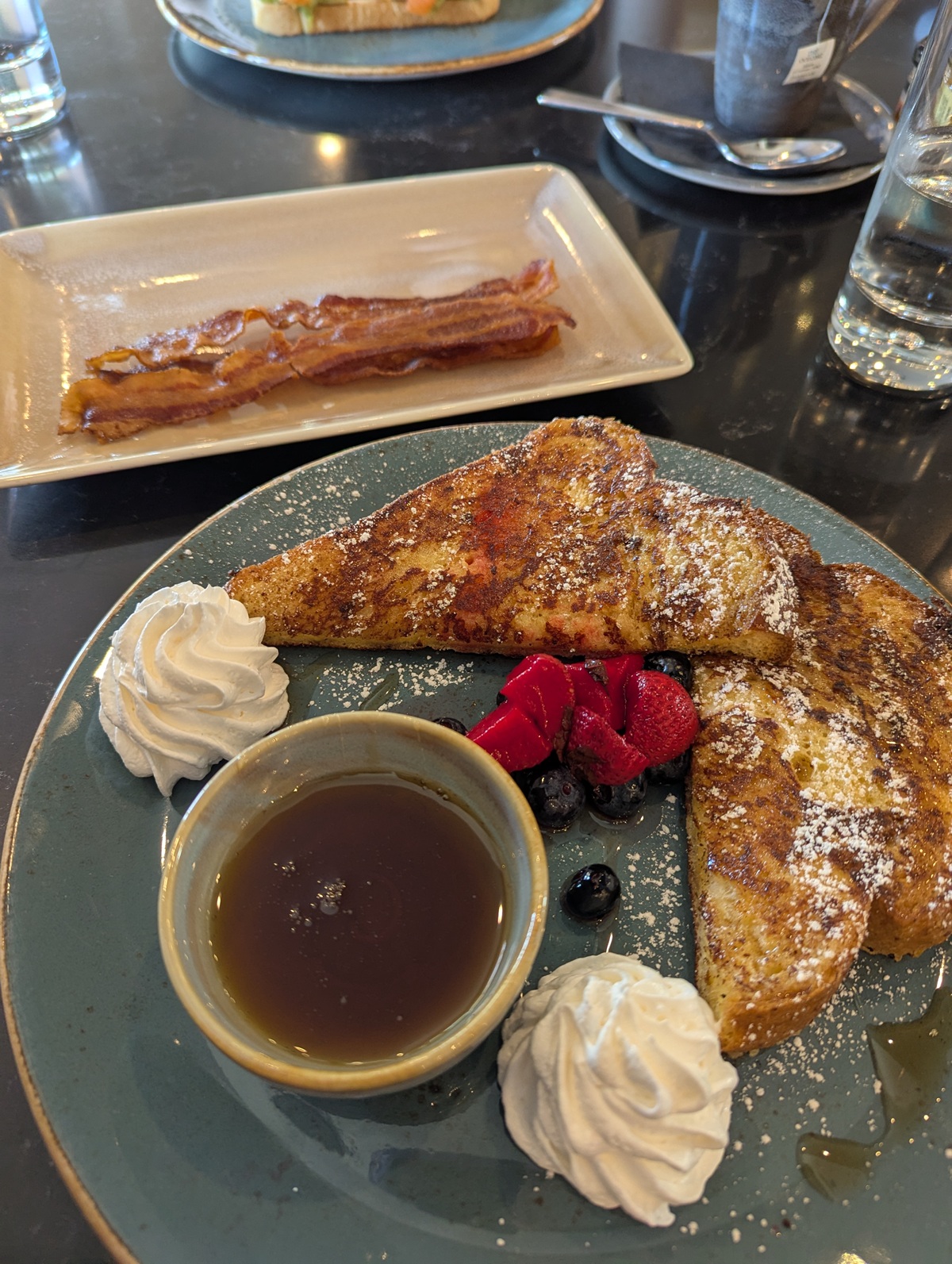 For brunch, we had the Smoked Salmon Avocado Toast and the Blueberry Maple Pancakes with a side of bacon. They have a great selection of hot teas as well.