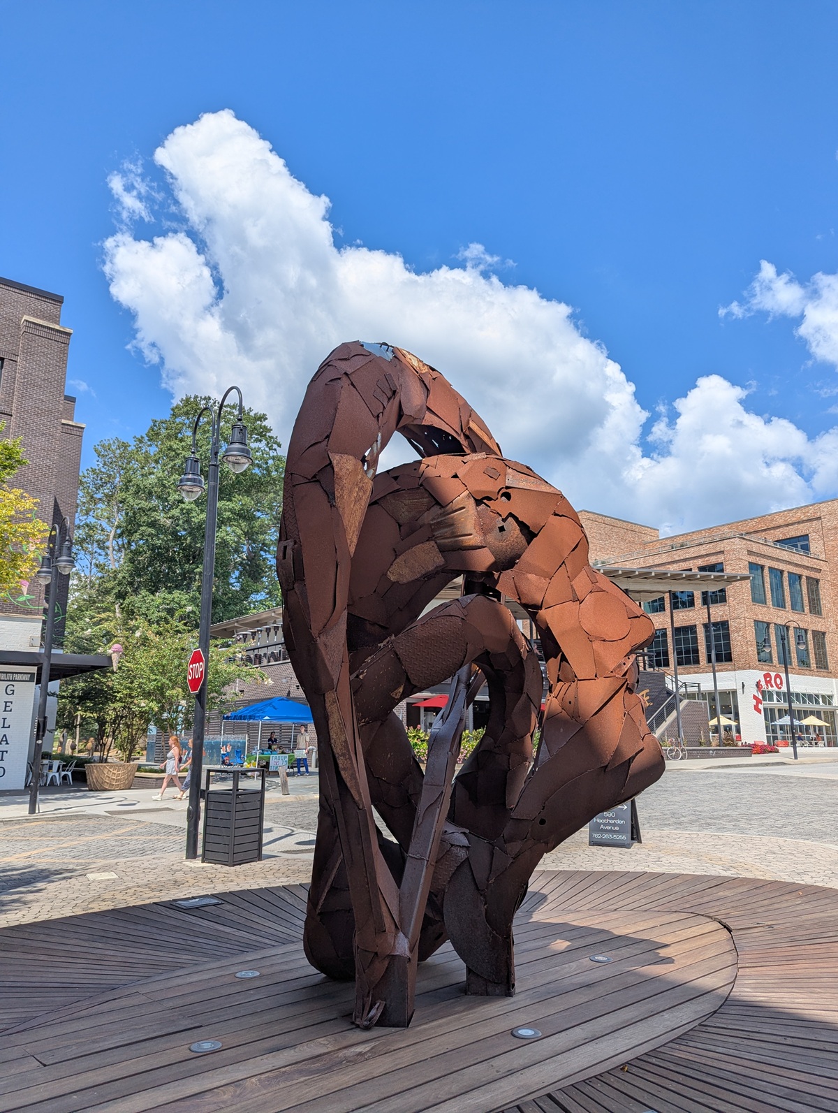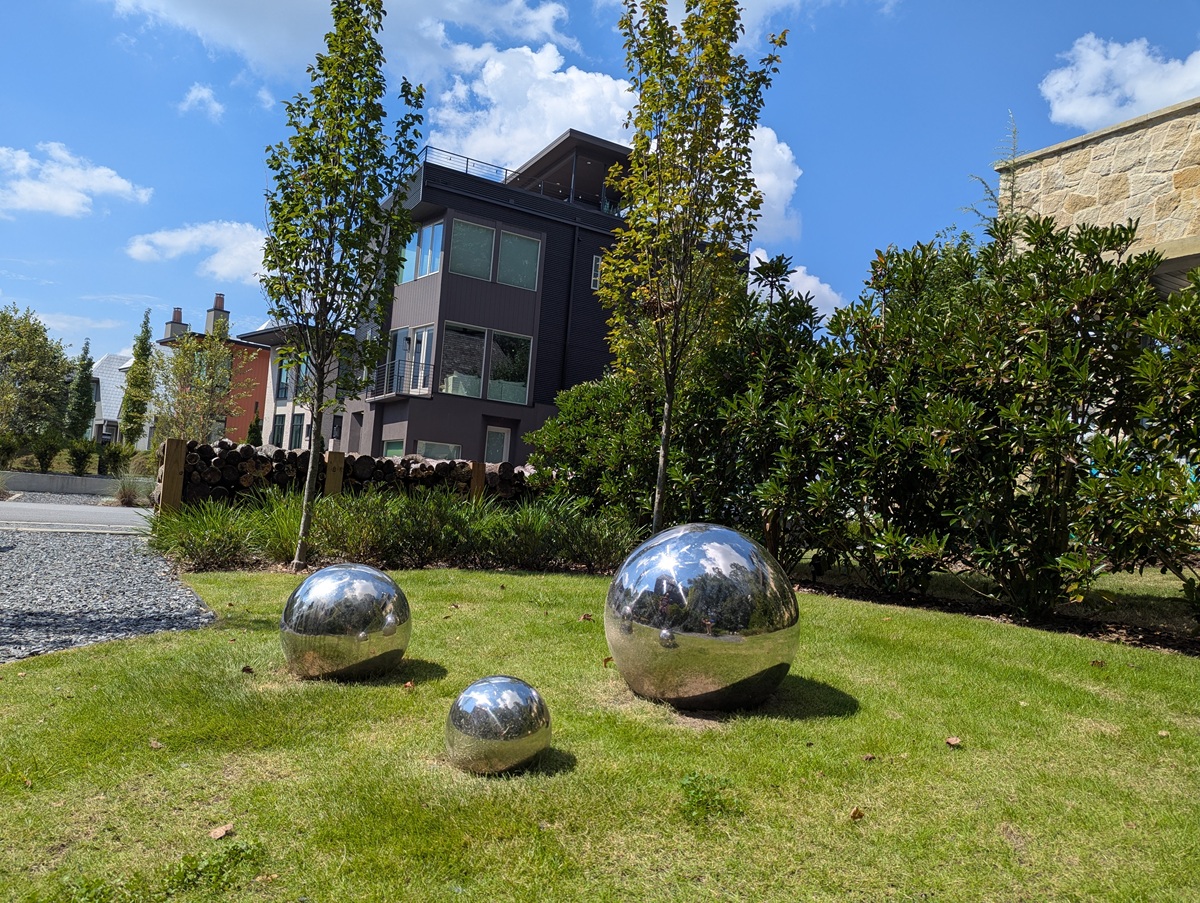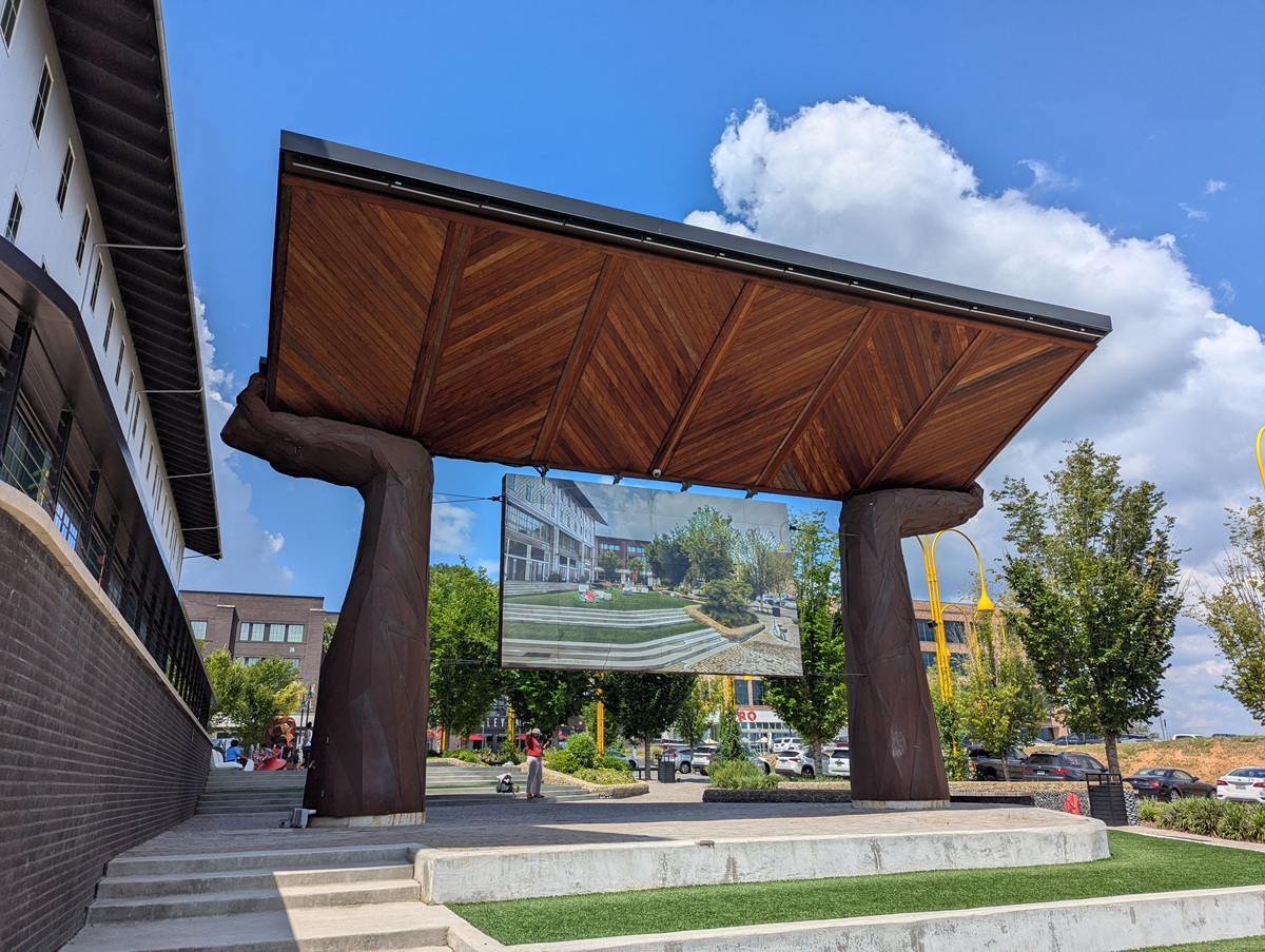 There’s also so much functional art — the street lamps have multiple different designs, the pavilion over the giant TV on the community green is held up by two hands, the playground and gazebos made natural wood and keep a rustic design.