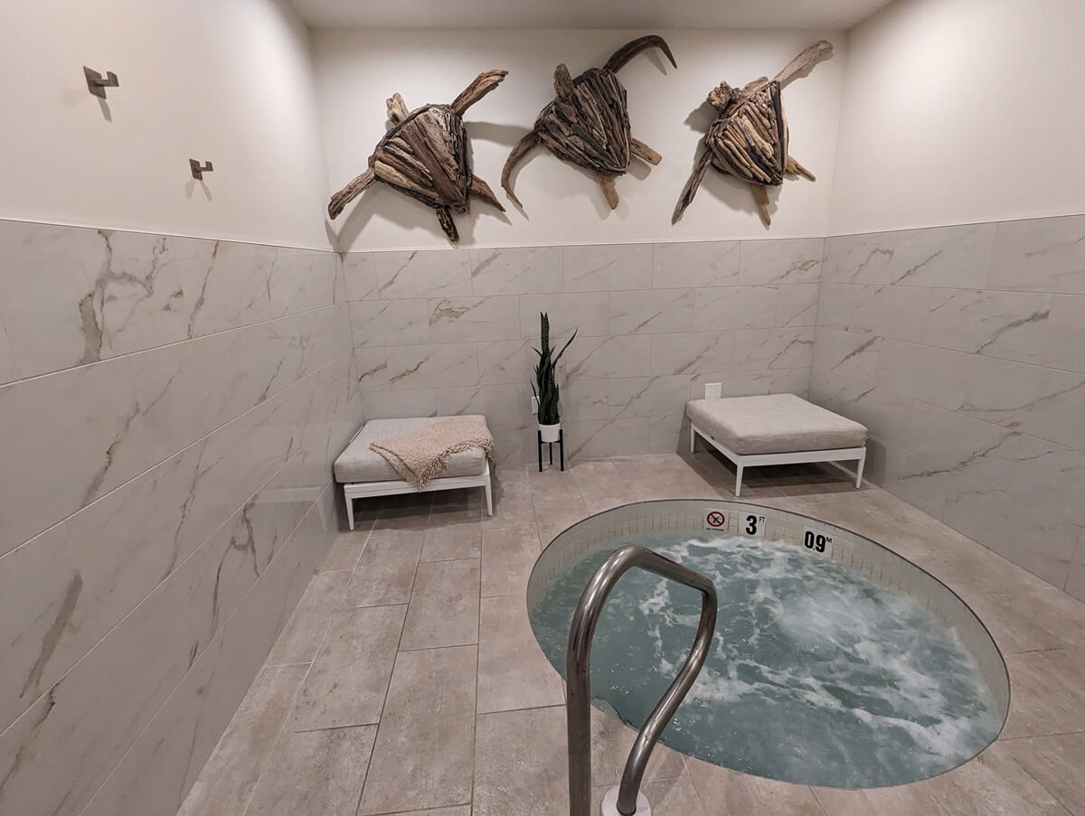 Spa amenities include a free mimosa, a relaxation room with a hot tub and comfy chairs, robes and sandals, and locker rooms with showers and everything you need to get ready after your treatment.