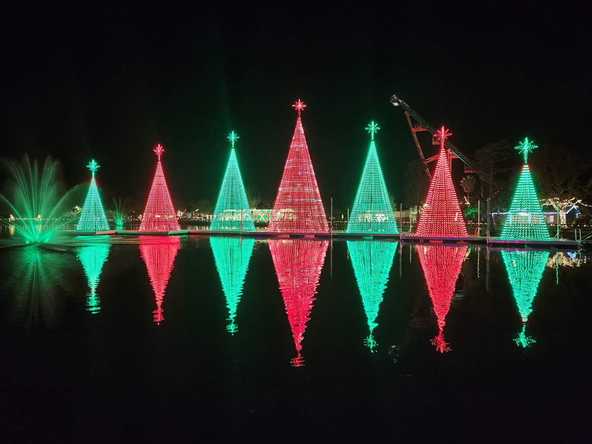 Seven tall, illuminated Christmas tree structures with lights are reflected on a calm lake at night during the Carol of the Animals Lake Show at Wild Adventures Christmas Wild & Bright in Valdosta, Georgia.